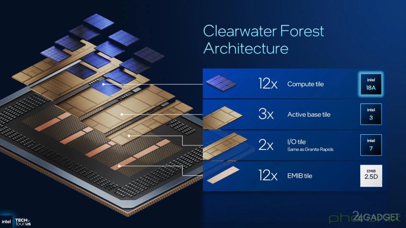 Кроме того, в Clearwater Forest используется новая технология корпусирования Foveros-S. Она предлагает 3D-стекирование чипов, что, по заявлению компании, позволяет объединять и интегрировать несколько чиплетов в современные SoC, обеспечивая гибкость, масштабируемость и производительность на системном уровне. Техпроцесс Intel 18A закладывает основу как минимум для трёх будущих поколений клиентских и серверных продуктов Intel.