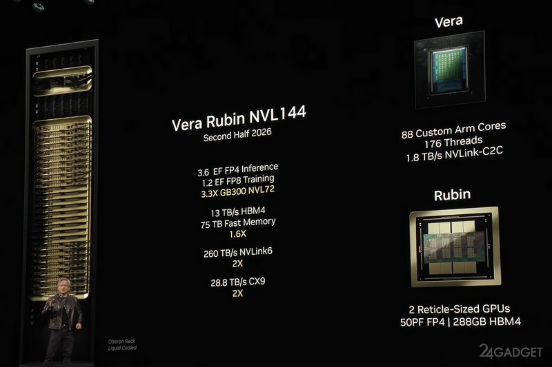На базе новых ускорителей Nvidia предложит самые разные системы, например новые Compute Tray, включая CPX-версию для задач с большим контекстом ИИ-моделей. Также компания рассказала о готовых серверных стойках Vera Rubin NVL144 с производительностью 3,6 Эфлопс (3,6 квинтильона операций в секунду) для запуска уже обученных ИИ-моделей (FP4 inference), а также 1,2 Эфлопс для обучения моделей (FP8 training).