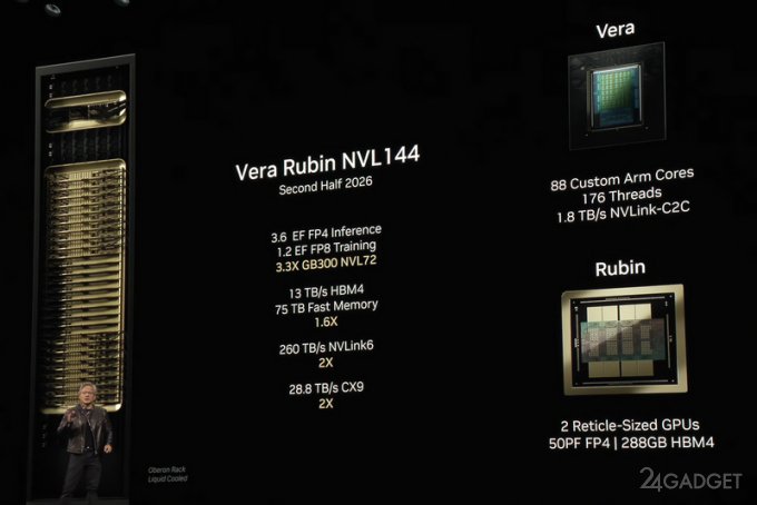 Каждый GPU Rubin состоит из двух больших кристаллов с ядрами CUDA и восьми стеков высокоскоростной памяти HBM4 объёмом 288 Гбайт. Характеристики GPU не уточняются, равно как и пропускная способность памяти. Однако отмечается, что одна система Vera Rubin Superchip обеспечивает производительность в ИИ-операциях (FP4) на уровне 100 Пфлопс (100 квадриллионов операций в секунду).