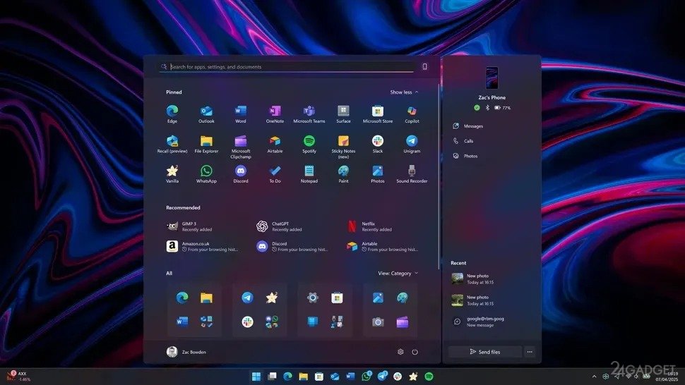 Новое меню «Пуск» стало более настраиваемым. Теперь можно закреплять больше значков приложений, скрывать рекомендуемую ленту и изменять вид списка всех приложений. Теперь список находится на главной странице меню «Пуск». Кроме того, можно добавить или скрыть приложение Phone Link одним нажатием кнопки, а само меню «Пуск» теперь масштабируется в зависимости от размера экрана.