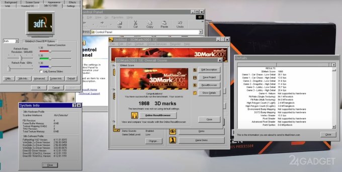 Яркий пример почти невероятного сочетания старого и нового компьютерного «железа» представил блогер с ником Omores на YouTube. Ему удалось запустить 3D-ускоритель 3dfx Voodoo2 1998 года, используя сервисы, написанные для ОС 1996 года, с экспериментальным 64-битным драйвером 2006 года на ПК с ОС 2011 года и процессором 2024 года. И не просто запустить, но и убедиться, что подобное сочетание нормально показывает себя в игре Quake 2 и бенчмарке 3D Mark 2001 SE.