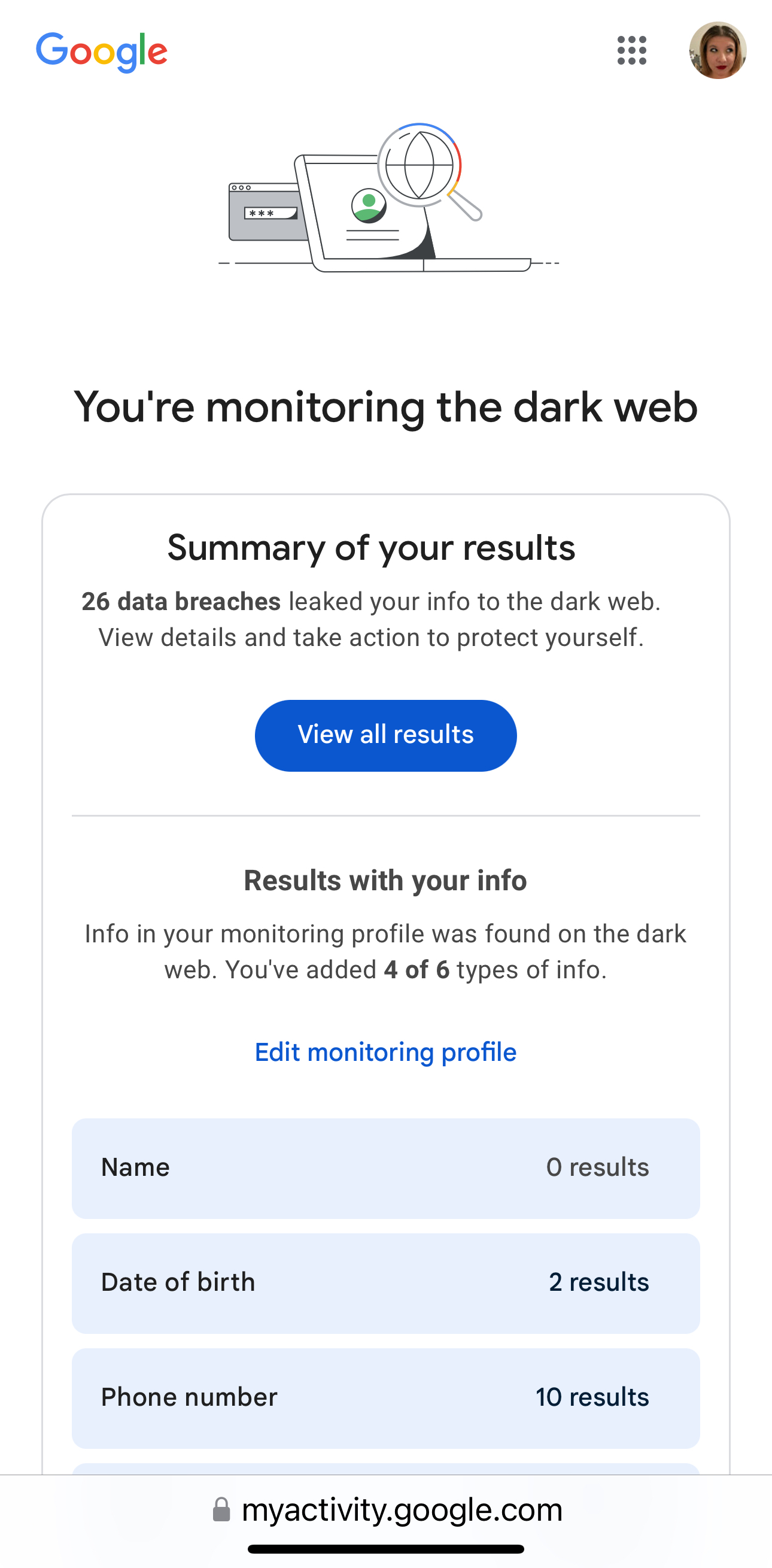 «Отчёт о пользовательских данных в даркнете» — это сводка личной информации пользователя, которую Google нашёл в «скрытом» интернете. Она включает в себя номер телефона, имя, адрес электронной почты и номер социального страхования. «Сканер» уведомляет пользователя о находках, если включить эту функцию.