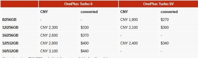OnePlus Turbo 6 и Turbo 6V очень похожи друг на друга. Модель Turbo 6 более премиальная. Её стоимость начинается с 2300 юаней (около $330) за конфигурацию с 12/256 Гбайт памяти. В свою очередь модель Turbo 6V более доступа — цена на неё начинается с 1900 юаней (около $270) за версию с 8/256 Гбайт памяти. Более подробно о конфигурациях и ценах можно узнать в таблице ниже.
