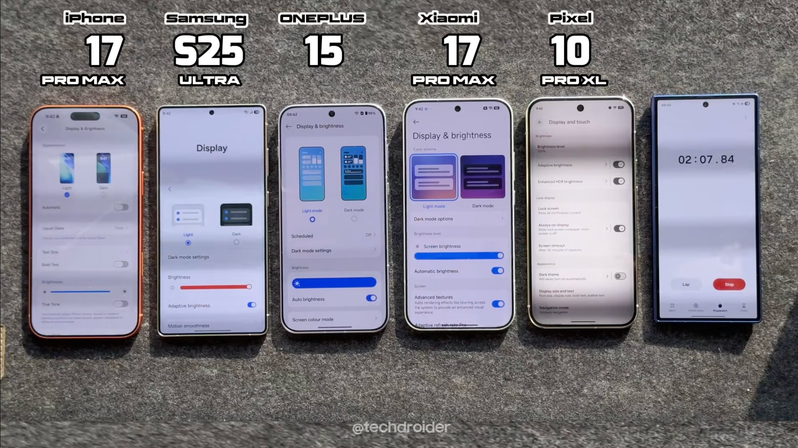 Для теста были взяты iPhone 17 Pro Max, Pixel 10 Pro XL, OnePlus 15, Galaxy S25 Ultra и Xiaomi 17 Pro Max. Аппараты вынесли на улицу, выкрутили яркость на максимум и положили под палящим солнцем на 30 минут. Дополнительно на всех смартфонах включили автоматическую регулировку яркости, при которой обычно яркость заметно выше, чем при ручной регулировке. Также на устройствах установили одинаковые обои и схожее наполнение рабочего стола.