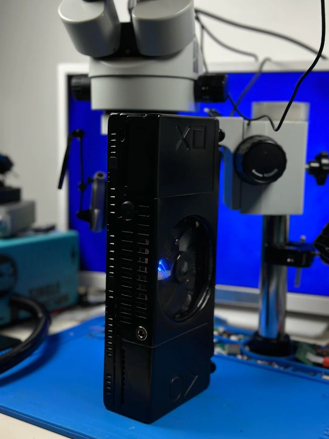 Систему охлаждения пришлось переделать на кастомную с микроконтроллером ESP32, одним вентилятором и самописным ПО, которое следит за температурой и энергопотреблением в реальном времени. По словам автора проекта, при низкой и средней загрузке можно рассчитывать на 2,7–3 часа работы, а при сильной (88 Вт) — на час-полтора.