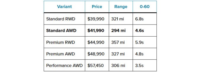 Комплектация Standard AWD оснащается двумя двигателями и полным приводом. Заявленное время разгона до «сотни» составляет 4,6 секунды, а запас хода при замере по методике EPA — 473 км. В США такой вариант оценён в $41 990.