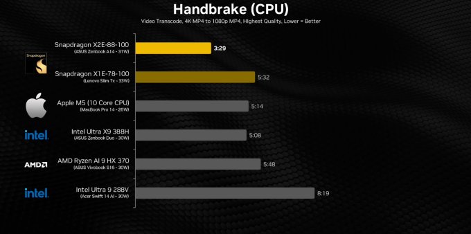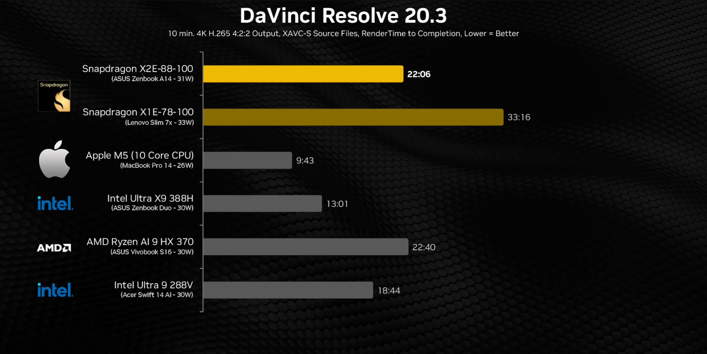 В задачах рендеринга и кодирования видео (Blender и Handbrake) X2 Elite также оказался быстрее своих соперников. В Blender 5.01 новинка справилась за 3 минуты 31 секунду, тогда как X Elite потребовалось 5 минут 24 секунды, а M5 — 5 минут 33 секунды. В Handbrake результат составил 3:29 против 5:32 и 5:14 соответственно. Единственным тестом, где Apple сохранила серьёзный отрыв, стал DaVinci Resolve: M5 завершил задачу за 9 минут 43 секунды, тогда как Snapdragon X2 Elite потребовалось 22 минуты 6 секунд.