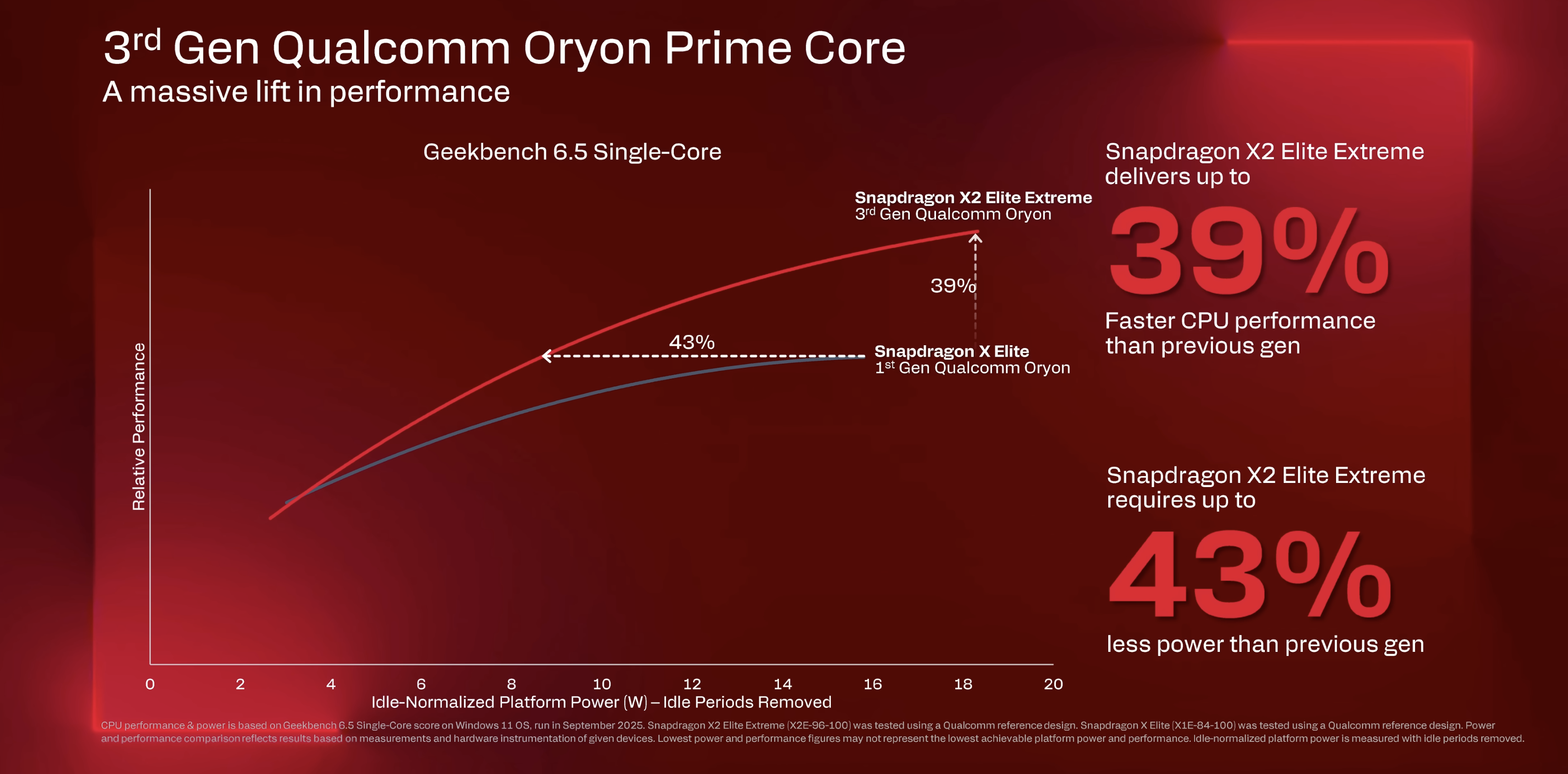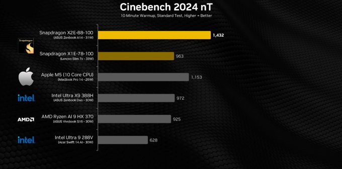 В Cinebench 2024 в однопоточном режиме X2 Elite набрал 146 баллов — на 35% больше, чем X Elite (108), но уступил M5, который получил 200 баллов. Зато в многопоточном тесте новый чип Qualcomm вырвался вперёд: 1432 балла против 1153 у M5 и 963 у X Elite. Это преимущество в 24% над M5 и почти 49% над прошлогодней моделью.