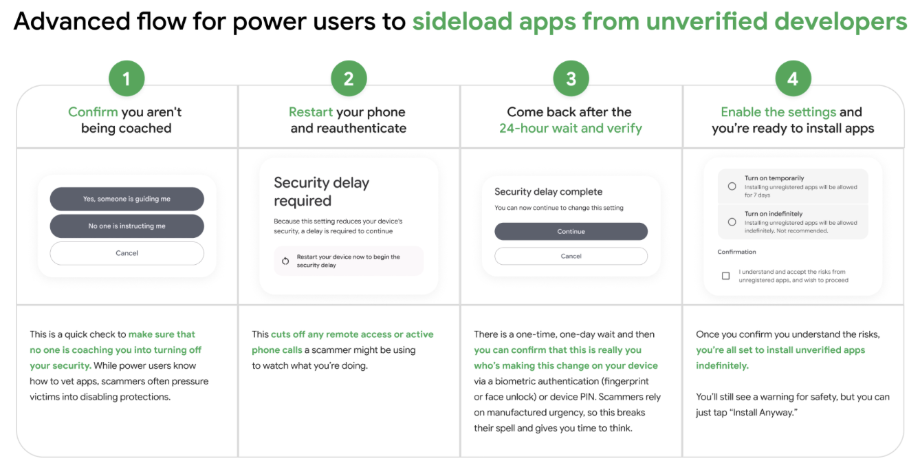 На этот раз речь идёт о полной переработке самого процесса. Компания не убирает возможность установки приложений из неизвестных источников, но фактически вводит дополнительные ограничения. Их цель — снизить риск установки вредоносных приложений и защитить пользователей от мошеннических схем.