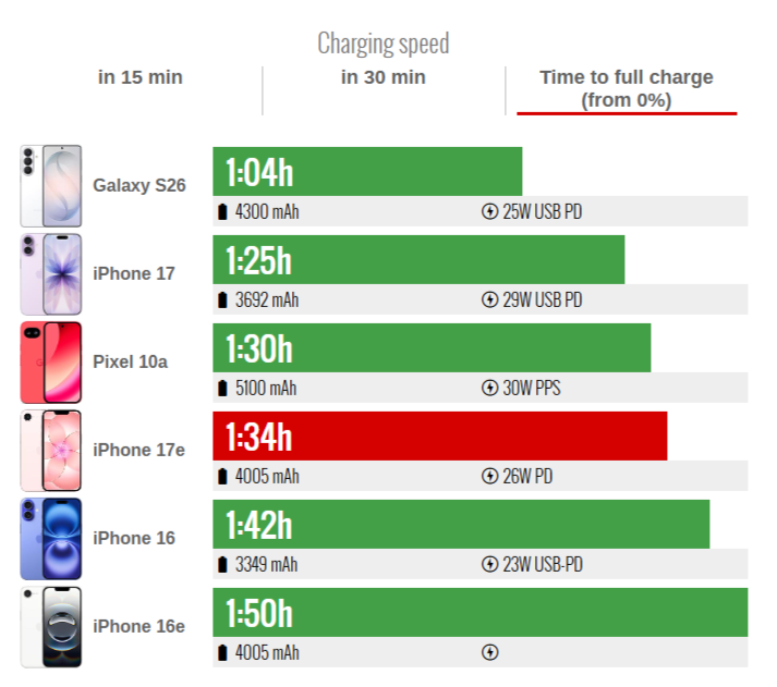 На восполнение ресурса АКБ с нуля до 100% у iPhone 17e ушёл 1 час 34 минуты. Это на 15 минут быстрее, чем у предшественника (1:50), но всё ещё недотягивает до многих Android-устройств в том же ценовом сегменте — например, Samsung Galaxy S26 (1:04).