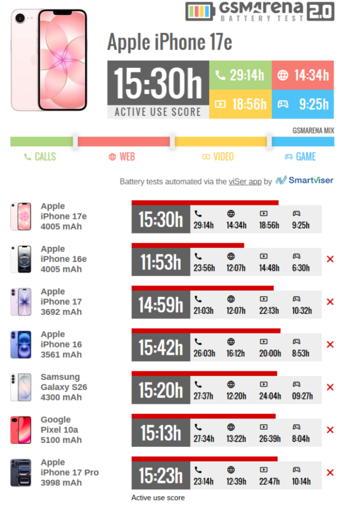 В режиме активного использования iPhone 17e проработал 15 часов 30 минут. Этот результат оказался лучше предшествующего ему iPhone 16e (11:53), базовой модели iPhone 17 (14:59) и версии iPhone 17 Pro (15:23). Кроме того, смартфон оказался автономнее решений конкурентов в лице Google Pixel 10a (15:13) и Samsung Galaxy S26 (15:20).