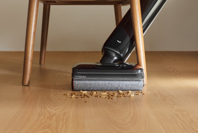 Дополняет маневренности необычный для таких типов устройств шарнир с поворотом до 80°. Достаточно просто вообразить себе траекторию движения, чтобы пылесос достал до самых дальних уголков комнаты и даже под мебелью. Причем щетка спроектирована так, что она забирает мусор вплотную к стенам с обеих сторон. Про непромытые полоски вдоль плинтуса, которые раньше приходилось дотирать тряпкой, можно забыть.