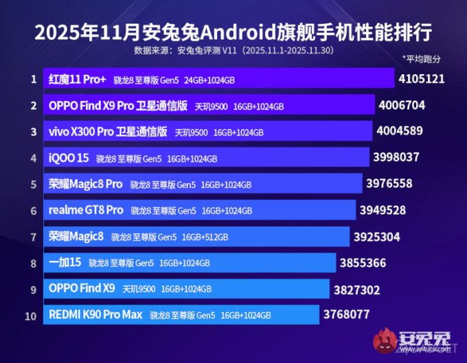 В ноябре в продажу поступила первая партия флагманских смартфонов на базе процессоров Qualcomm Snapdragon 8 Elite Gen 5 и MediaTek Dimensity 9500. Лидером в этом рейтинге с большим отрывом стал игровой Red Magic 11 Pro+ с воздушным и жидкостным охлаждением. Семь из десяти мест топа заняли смартфоны на новом чипе Snapdragon. В рейтинге субфлагманов доминируют модели на MediaTek.